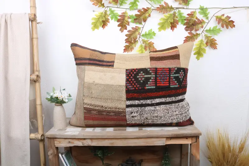 Beige & Brown Embroidered Throw Pillow, Handmade Patchwork Pillow