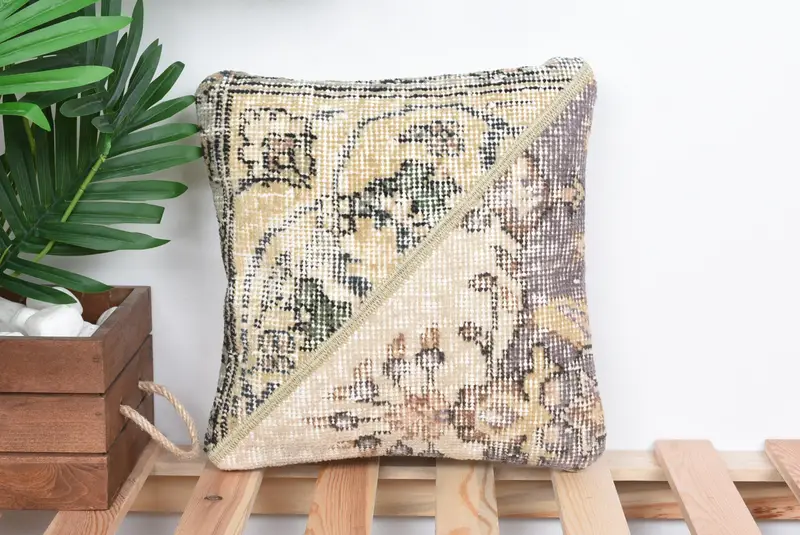 Embroidered Beige & Gray Patchwork Throw Pillow, Vintage Handmade Cushion