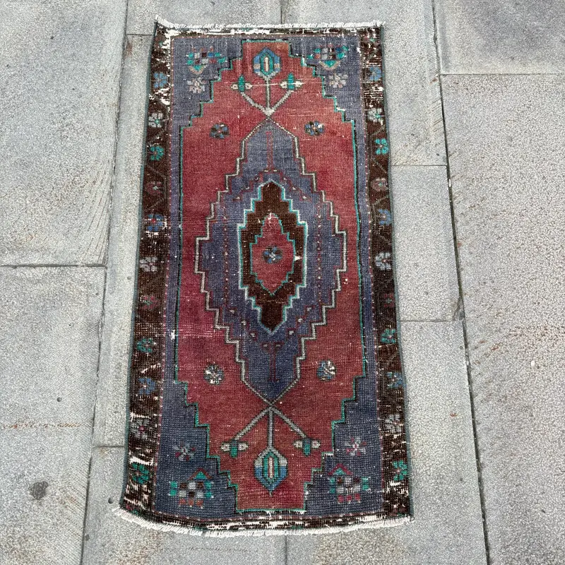 Purple Rug with Brown Motifs, 1.4x3 ft Geometric Design