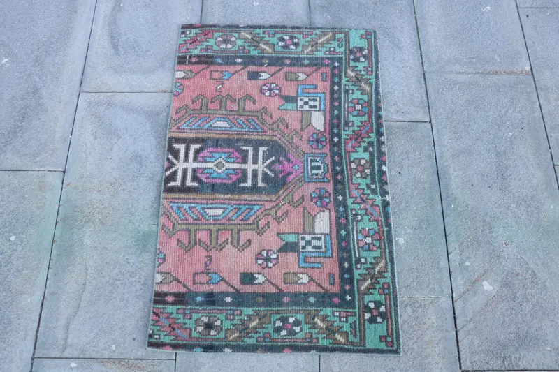 Red Persian Rug, 1.7x2.8 ft with Green Accents