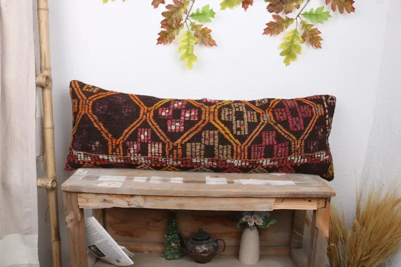 Orange & Brown Geometric Linen Throw Pillow, Handmade Vintage Pillow