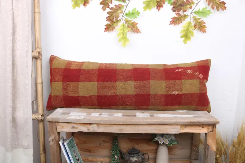 Red Striped Throw Pillow, 12x36 Embroidered Cushion with Vintage Charm