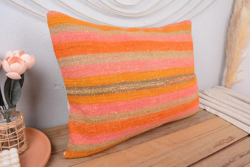 Orange & Pink Patchwork Throw Pillow, Handmade Vintage Rectangle Pillow