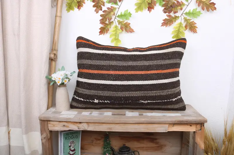 Brown & White Striped Pillow, Embroidered Vintage Throw Pillow