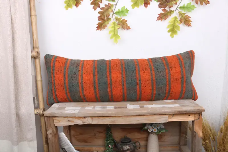 Orange & Gray Striped Throw Pillow, Embroidered Vintage Cushion