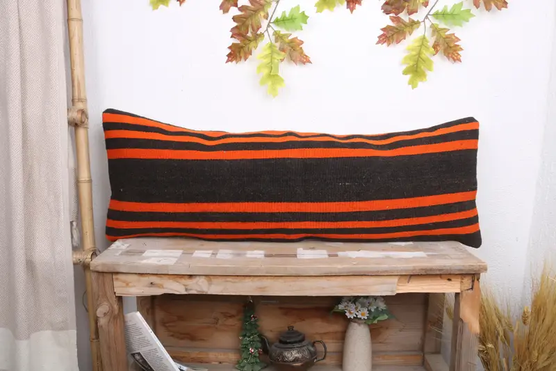 Handmade Striped Linen Throw Pillow, 12x36 Embroidered Vintage Pillow