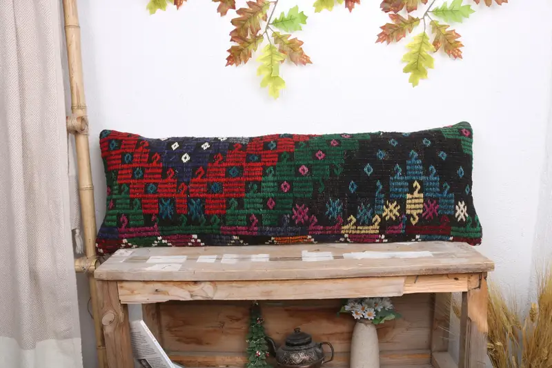 Handmade Green & Red Geometric Throw Pillow, Vintage Linen Pillow