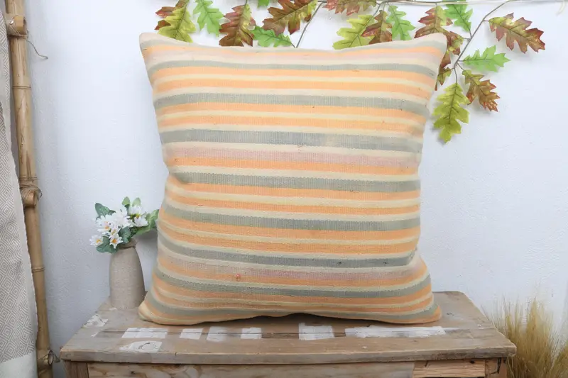 Brown & Gray Striped Throw Pillow, Vintage Embroidered Cushion