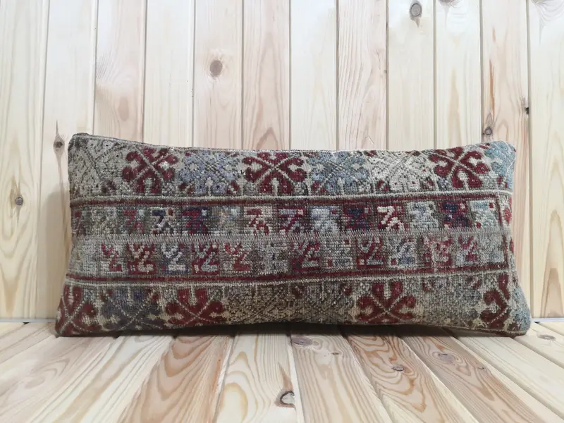 Handmade Embroidered Wool Throw Pillow, Vintage Patchwork Rectangle Pillow