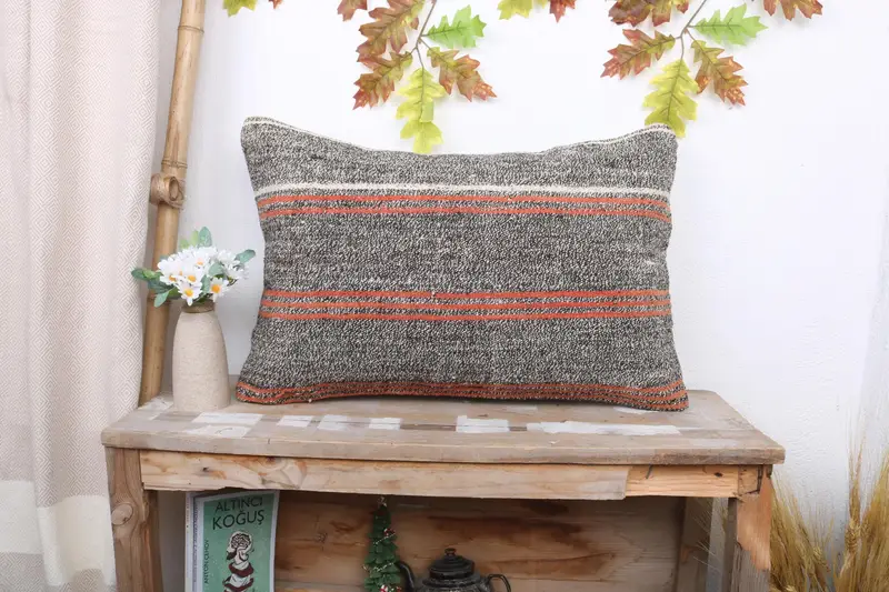 Brown & Red Striped Throw Pillow, Vintage Embroidered Cushion