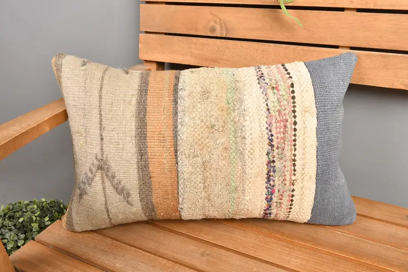 Beige & Gray Striped Pillow, Embroidered Rectangle Throw Pillow