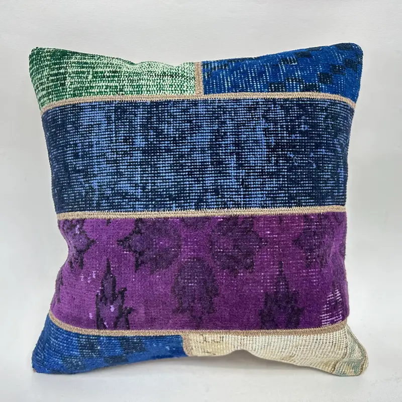 Embroidered Purple & Green Patchwork Throw Pillow, Vintage Handmade Cushion