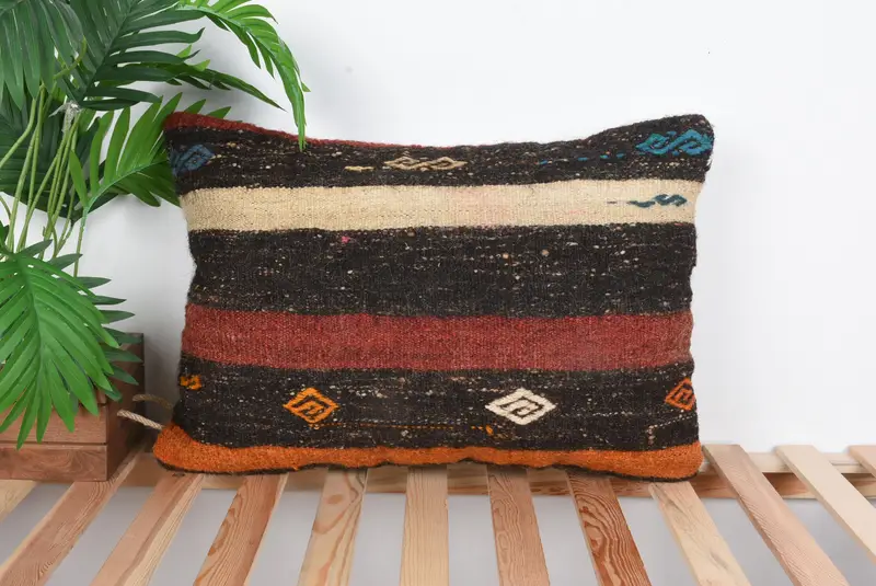 Brown & Red Striped Throw Pillow, Handmade Embroidered Cushion