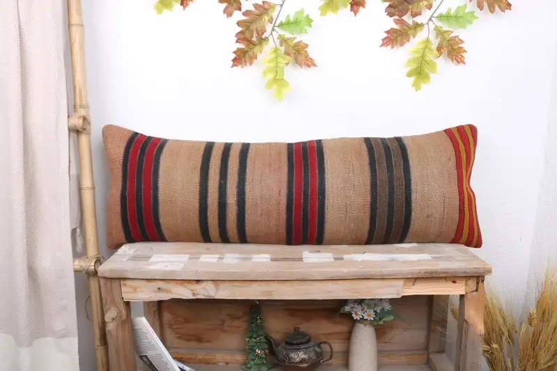 Embroidered Vintage Throw Pillow, Beige & Red Striped Pillow