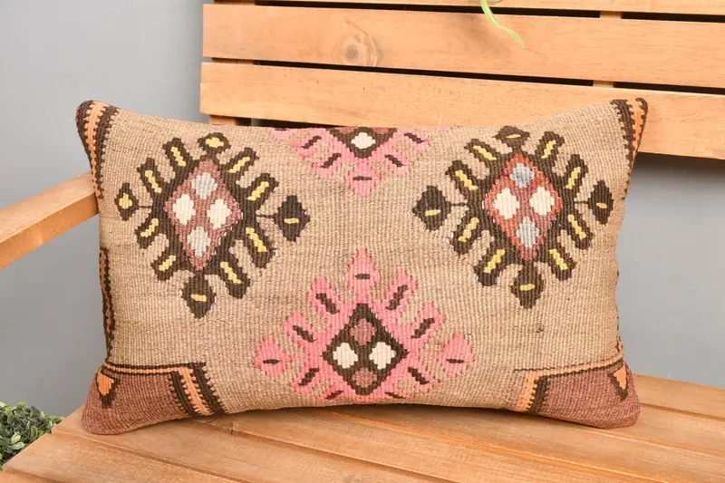 Geometric Pink & Brown Embroidered Pillow, Handmade Vintage Throw Pillow