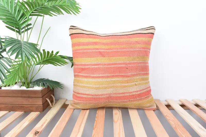 Handmade Embroidered Pillow, Pink & Orange Striped Throw Pillow