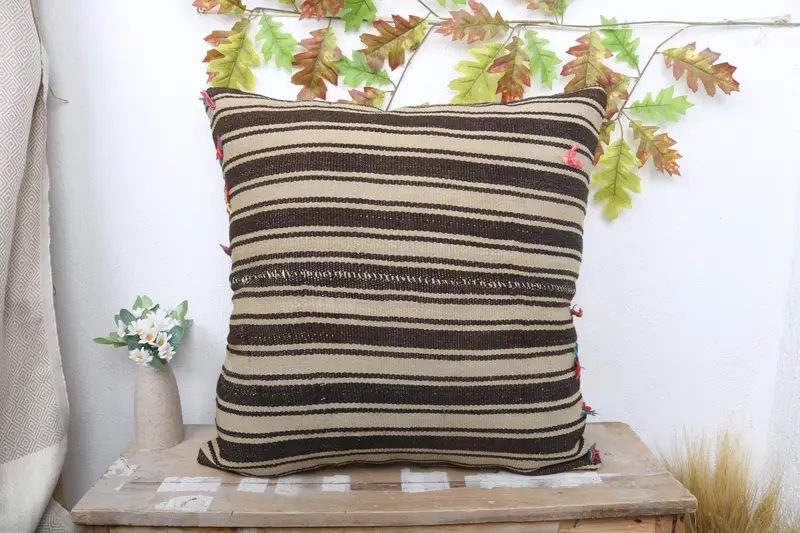 Beige & Brown Striped Throw Pillow, Handmade Embroidered Cushion