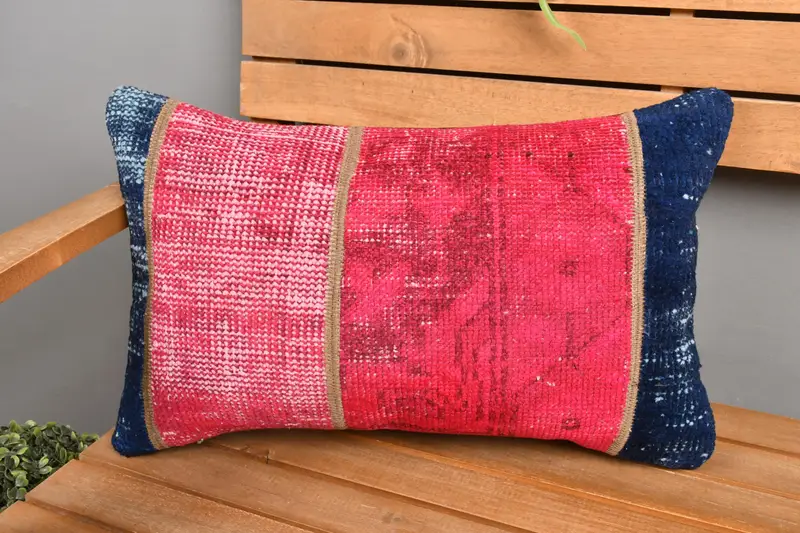 Red & Bronze Patchwork Throw Pillow, 12x20 Handmade Embroidered Pillow