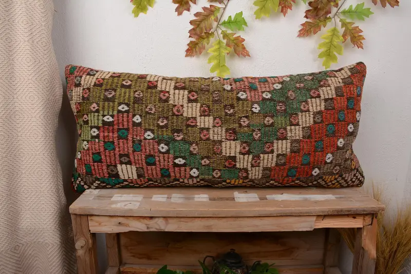 Handmade Green & Red Embroidered Pillow, 16x36 Vintage Throw Pillow
