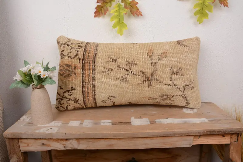 Embroidered Beige & Brown Pillow, 12x24 Handmade Throw Pillow