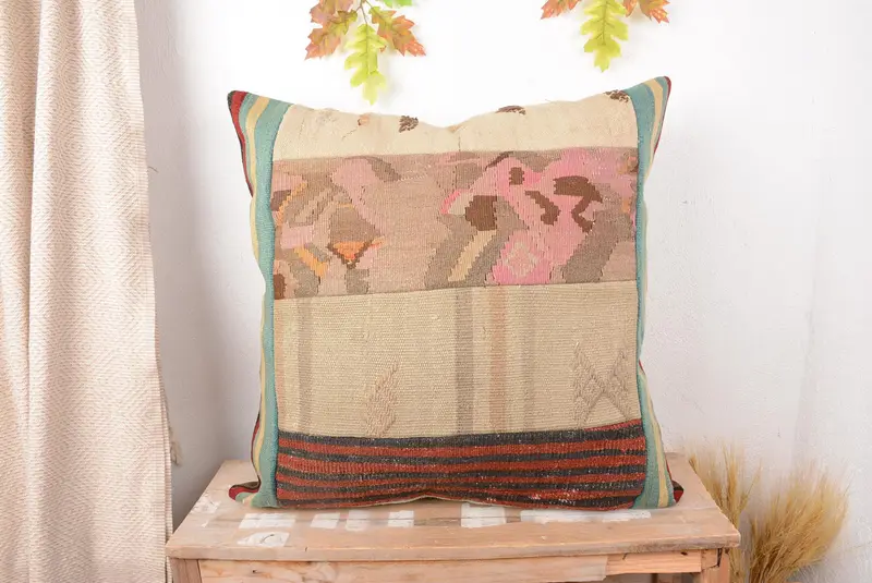 Beige & Pink Patchwork Throw Pillow, 28x28 Handmade Cushion
