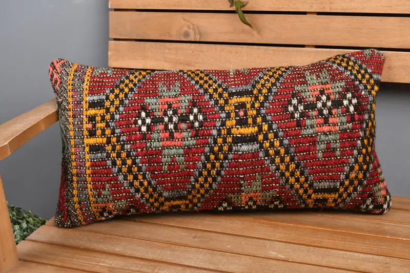 Red Southwestern Throw Pillow, 12x24 Handmade Embroidered Cushion