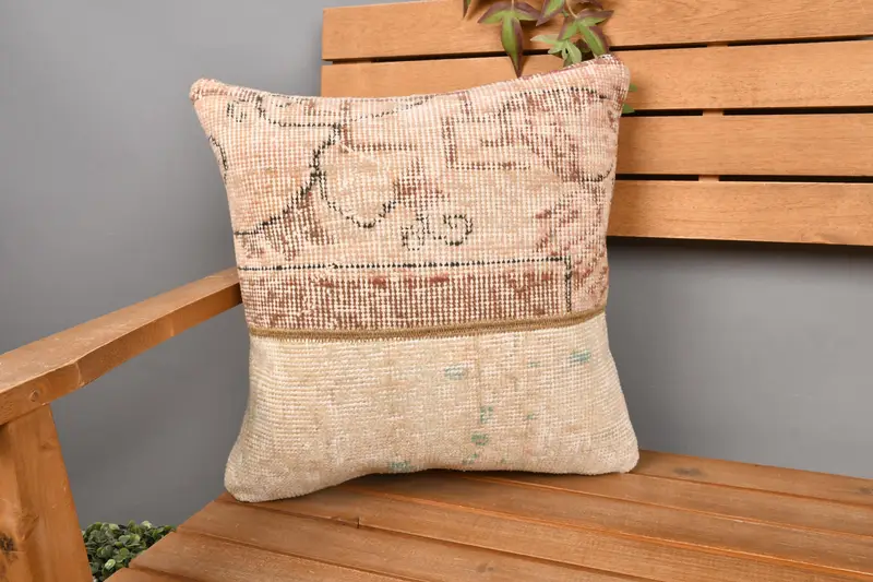 Embroidered Beige & Brown Throw Pillow, Handmade Patchwork Cushion