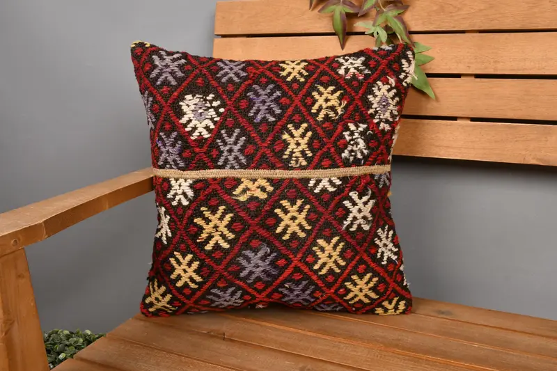 Red & Yellow Patchwork Throw Pillow, 16x16 Embroidered Cushion