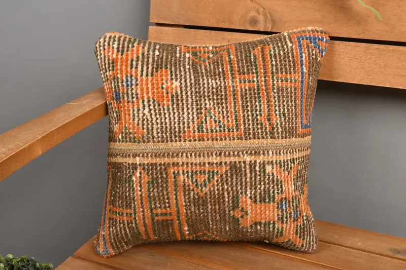 Brown & Orange Patchwork Throw Pillow, Handmade Vintage Cushion