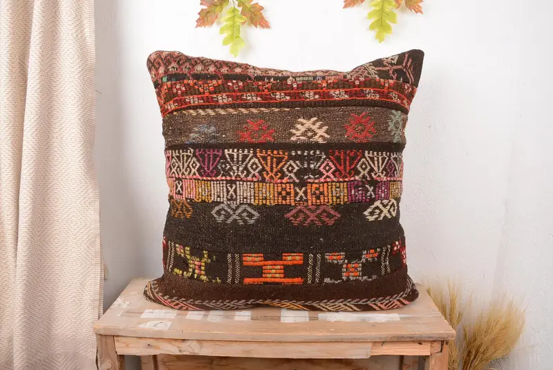 Brown & Orange Patchwork Throw Pillow, Embroidered Cushion