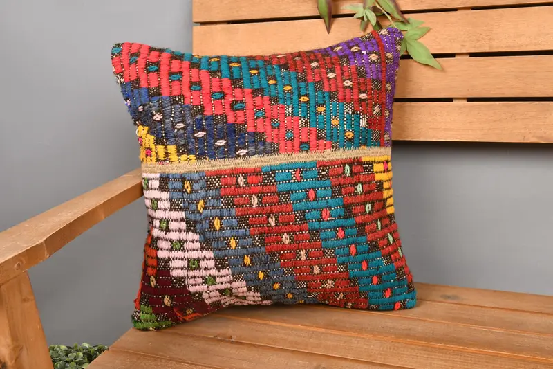 Red Linen Patchwork Throw Pillow, 16x16 Embroidered Vintage Cushion
