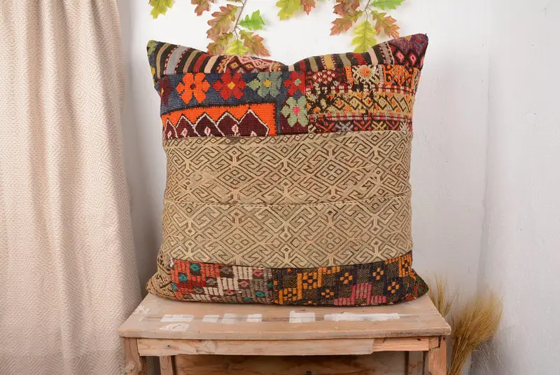 Beige & Bronze Patchwork Throw Pillow, Handmade Vintage Cushion