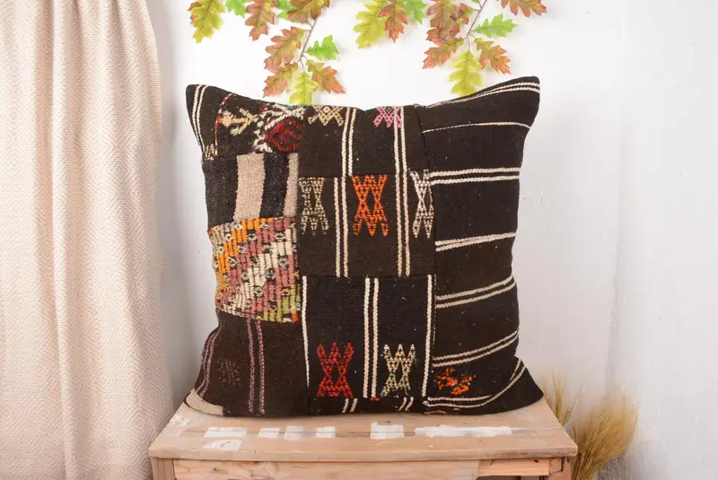 Brown & Beige Patchwork Throw Pillow, Vintage Embroidered Cushion