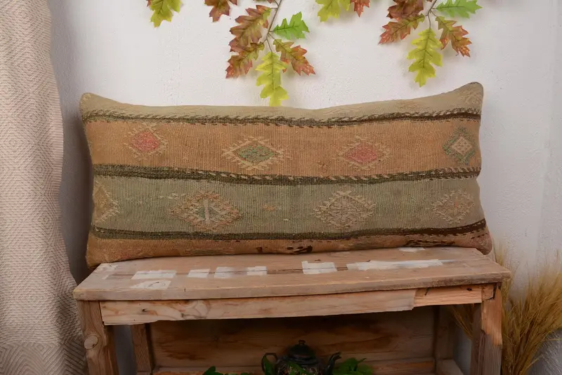 Brown & Green Geometric Throw Pillow, Vintage Embroidered Cushion