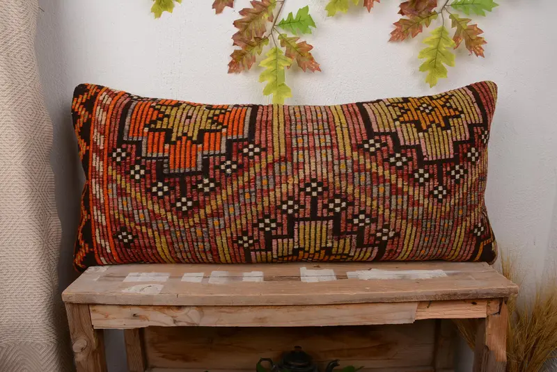 Red & Orange Geometric Throw Pillow, Handmade Linen & Wool Pillow