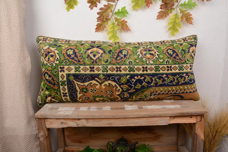 Green & Bronze Embroidered Throw Pillow, Handmade Vintage Cushion