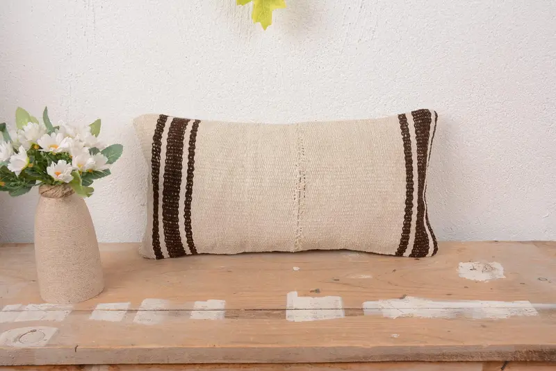 Handmade Beige & Brown Patchwork Throw Pillow, Vintage Rectangle Cushion
