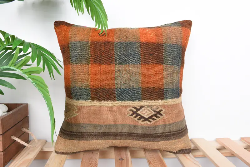 Orange & Bronze Patchwork Throw Pillow, Handmade Embroidered Pillow
