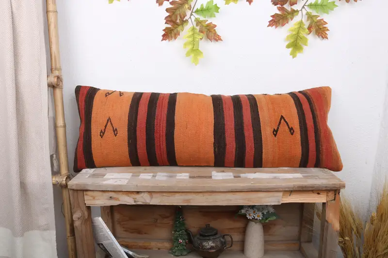 Handmade Embroidered Orange & Red Pillow, Vintage Striped Rectangle Throw Pillow