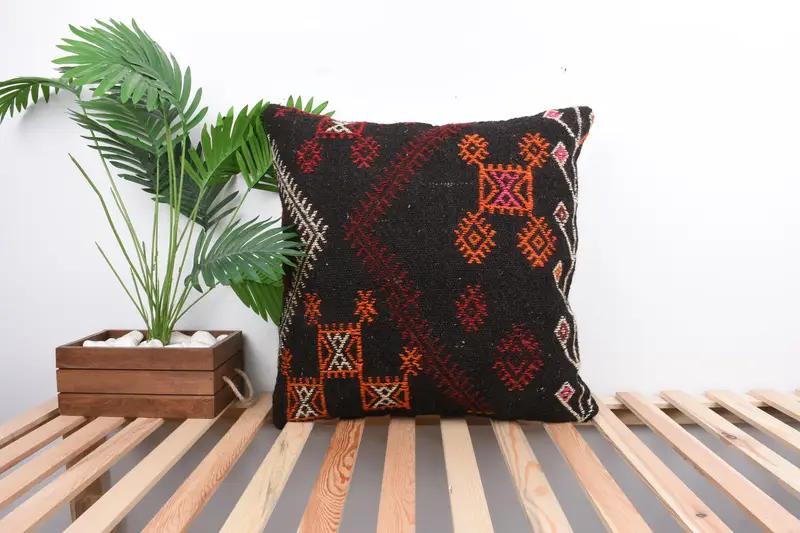 Brown & Orange Embroidered Throw Pillow, Handmade Geometric Pillow