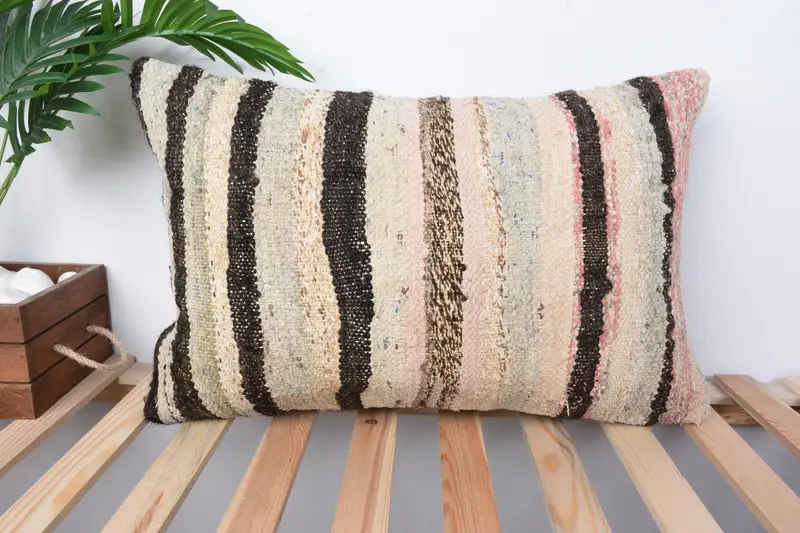 Handmade Striped Throw Pillow, 16x24 Embroidered Cushion with Vintage Charm