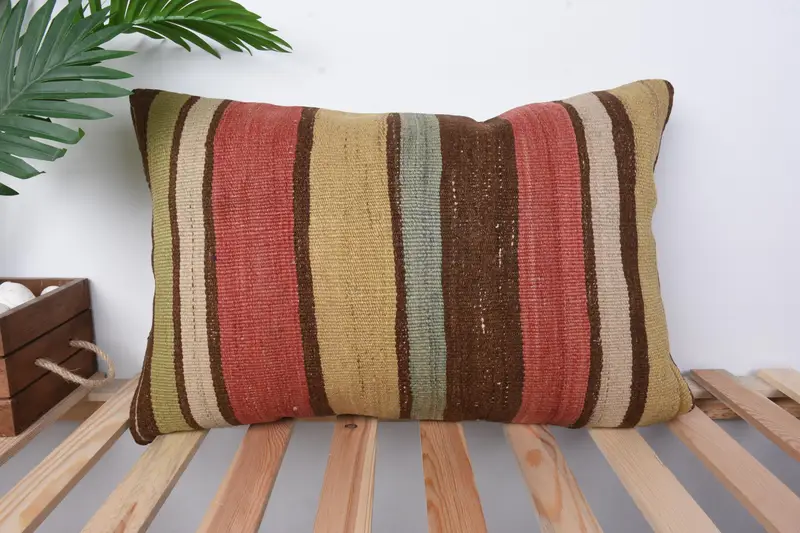 Red and Beige Striped Throw Pillow, Handmade Embroidered Cushion
