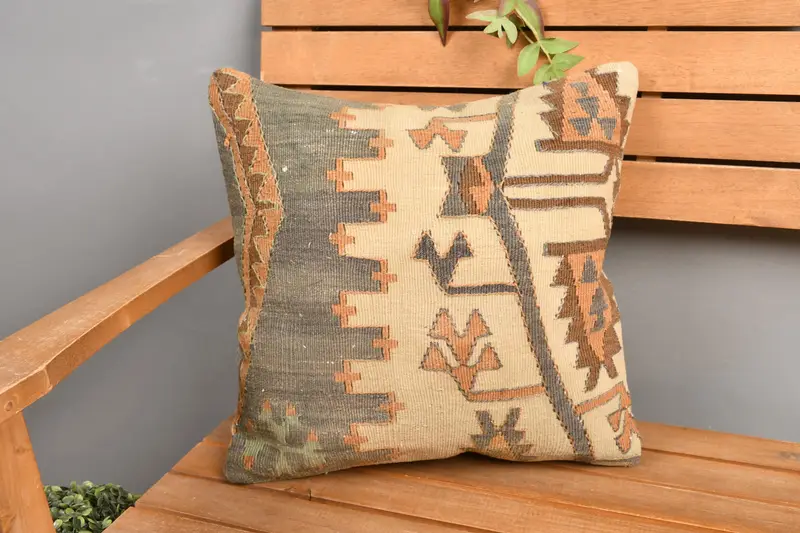 Geometric Beige & Green Throw Pillow, Handmade Linen Cushion