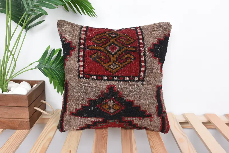 Red and Brown Geometric Throw Pillow, Handmade Vintage Linen Pillow