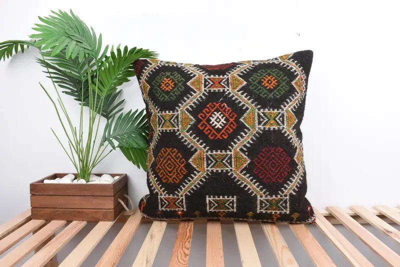 Brown Southwestern Kilim Throw Pillow, 24x24 Embroidered Vintage Pillow