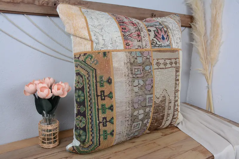 Beige & Brown Patchwork Throw Pillow, Vintage Embroidered Cushion