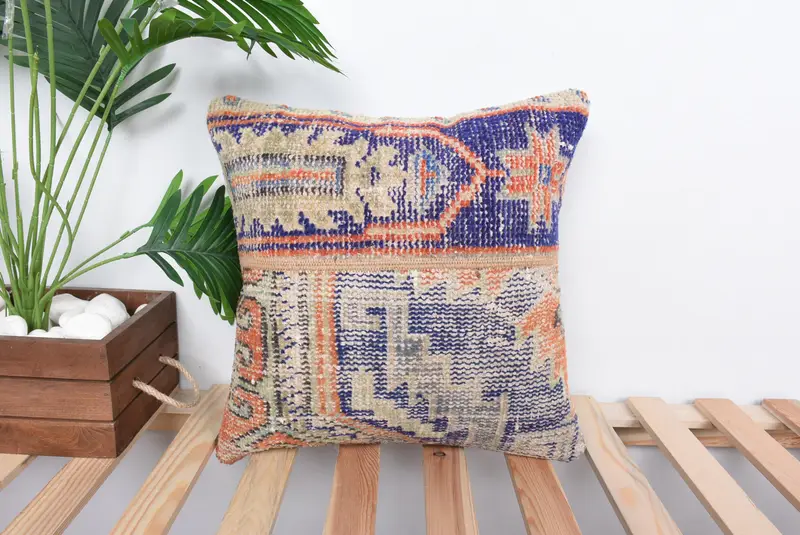 Blue & Red Patchwork Throw Pillow, 16x16 Embroidered Cushion