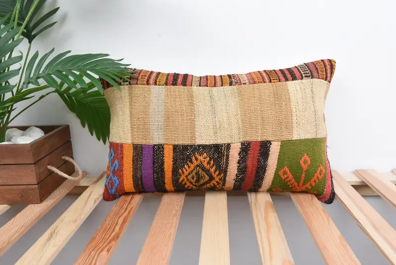 Beige & Orange Patchwork Throw Pillow, Handmade Linen Pillow
