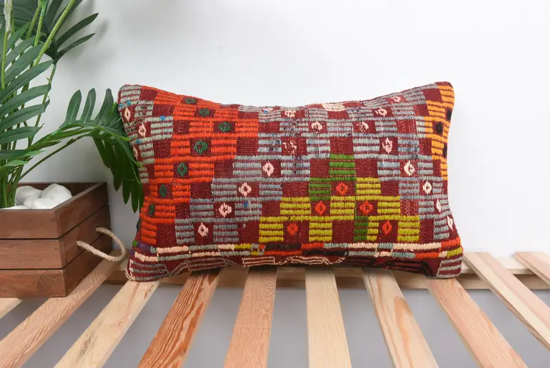 Red & Yellow Striped Throw Pillow, 12x20 Embroidered Cushion