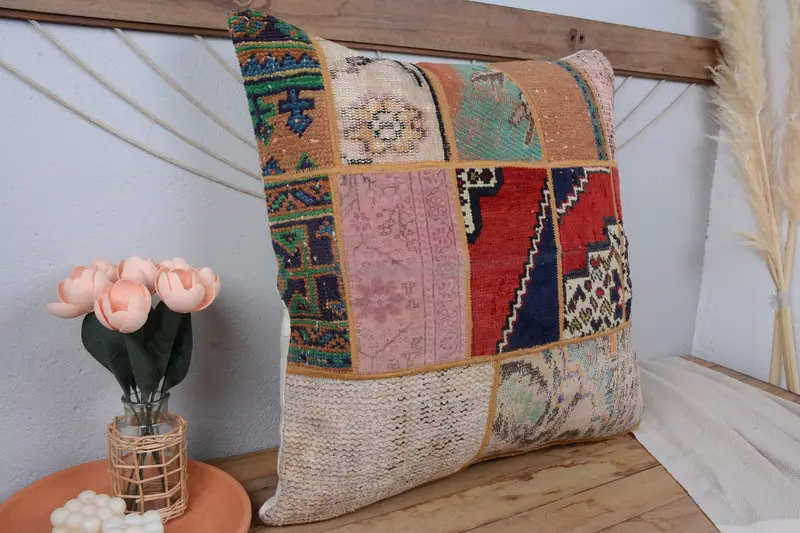 Red & Green Patchwork Throw Pillow, Handmade Embroidered Cushion